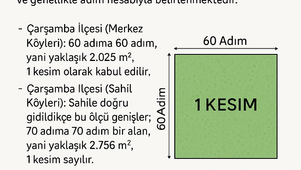 - Çarşamba İlçesi: Merkeze yakın köylerde, 60 adıma 60 adım 1 kesim yani 2025 m² olarak hesaplanmaktadır.